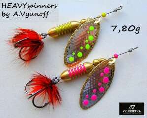 Мушка изготовлена из специальных природных (перо курицы или петуха) и/или синтетических материалов, которые так же являются как привлекающими элементами, так и имеют свою роль в конструкции блесны. Устойчивы к внешним воздействиям.