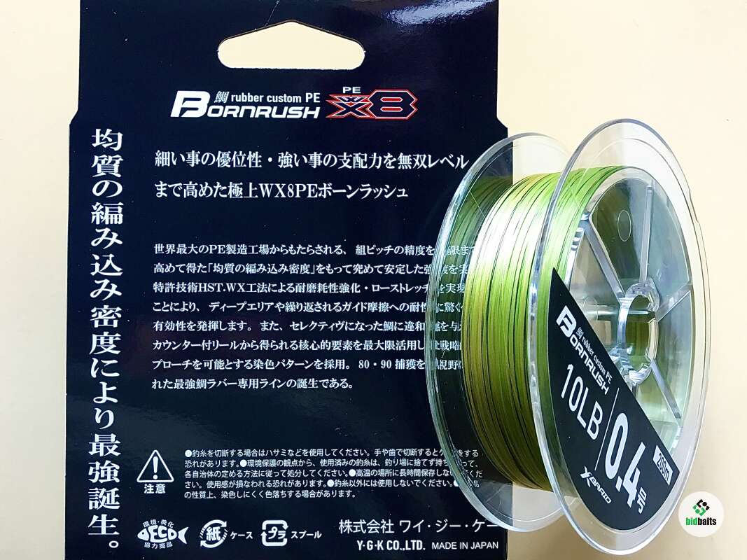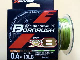 Bornrush PE X8 от YGK открывает новую страницу технологического развития в производстве восьмижильных шнуров. Основное достижение состоит в применении новой технологии плетения, повышающей плотность плетения. За счет этого шнур Bornrush стал более гладкий, и значительно менее растяжим, а это существенно повысило чувствительность. Так же в плетеном шнуре Bornrush PE X8 применяется новый состав пропитки - HST.WX, что позволило значительно улучшить абразивоустойчивость и сохранить мягкость плетеного шнура.