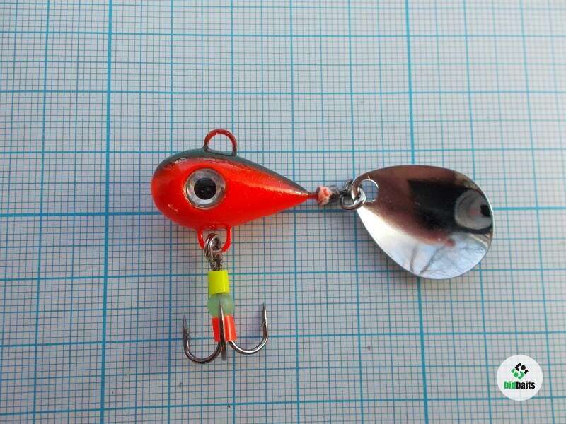 Вес 14 гр. Глаза вклеены в глазные ниши, это затрудняет хищнику повредить их и они будут долго оставаться привлекательной точкой для атаки. Тройник украшен яркими элементами и светонакопительной бусиной. Лепесток вращается ВСЕГДА, даже на падении.
