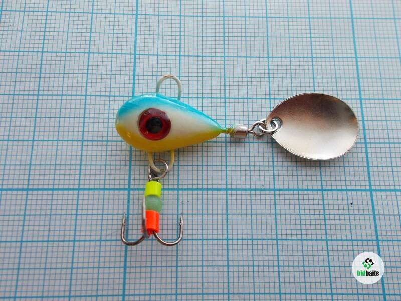 Вес 10 гр. Глаза вклеены в глазные ниши, это затрудняет хищнику повредить их и они будут долго оставаться привлекательной точкой для атаки. Тройник украшен яркими элементами и светонакопительной бусиной. Лепесток вращается ВСЕГДА, даже на падении.