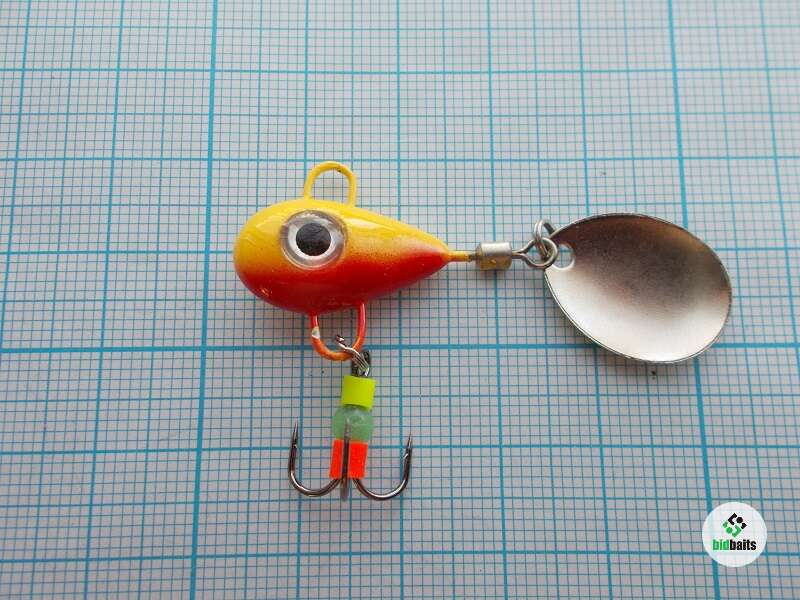 Вес 10 гр. Глаза вклеены в глазные ниши, это затрудняет хищнику повредить их и они будут долго оставаться привлекательной точкой для атаки. Тройник украшен яркими элементами и светонакопительной бусиной. Лепесток вращается ВСЕГДА, даже на падении.