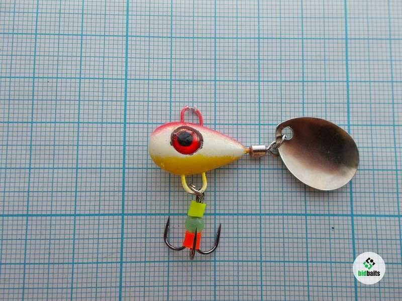 Вес 10 гр. Глаза вклеены в глазные ниши, это затрудняет хищнику повредить их и они будут долго оставаться привлекательной точкой для атаки. Тройник украшен яркими элементами и светонакопительной бусиной. Лепесток вращается ВСЕГДА, даже на падении.