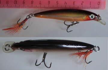 Воблер и лопатка без повреждений. Есть немного потёртость торца на лопатке; царапинка на спинке. Тройники острые; на переднем немного поверхностных пятен на одном крюке. Кисточка на заднем не облазит. Заводской шов склейки на спинке и как на нём лежит лакировка специально показал на фото (для идеалистов всё знать и видеть). На фото всё показал. В воде не проверял.