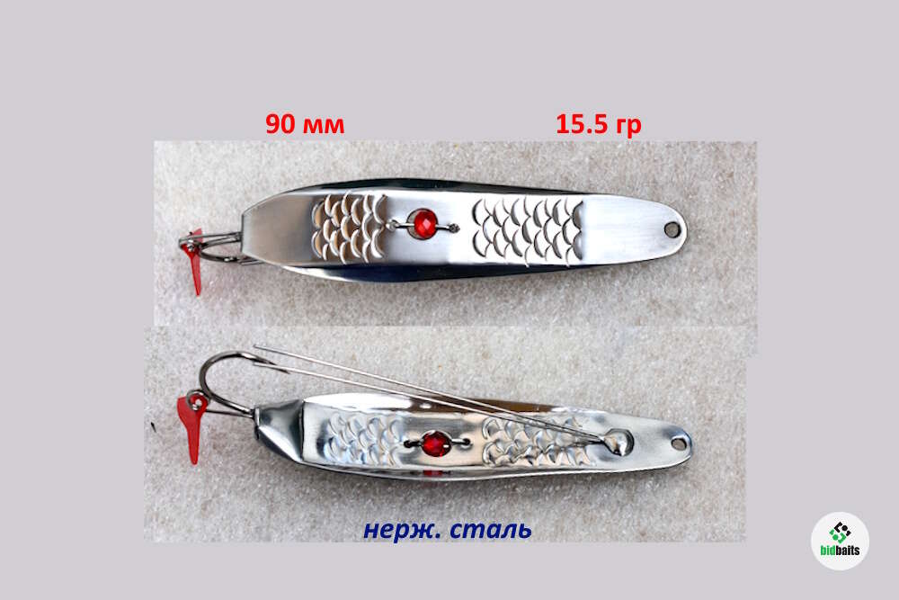 Блесна изготовлена из нерж. стали. Впаянный крючек из разделенного тройника. Двойной ус из пружинной нерж. проволоки надежно защищает крючек от любых препятствий. Впаянное заводное колечко позволяет устанавливать хвостик или флат с твистером. Движение змейкой с подьемом к поверхности, что позволяет делать длительные паузы.