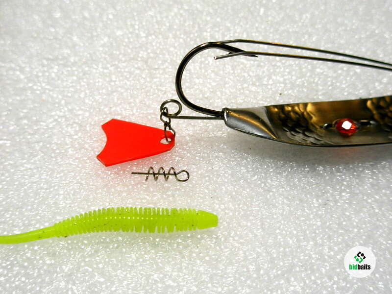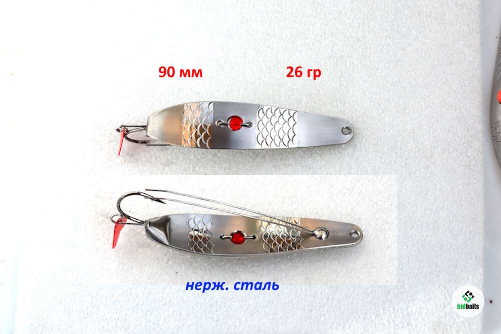 Блесна изготовлена из нерж. стали. Впаянный крючек из разделенного тройника. Двойной ус из пружинной нерж. проволоки надежно защищает крючек от любых препятствий. Впаянное заводное колечко позволяет устанавливать хвостик или флат с твистером.