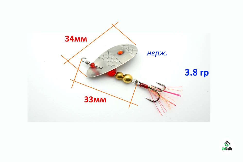 Ось из нерж. проволоки, крепежная петля отогнута на 90 град. , меньше закручивает шнур. Вращение более медленное, чем у классической блесны с дужкой. При движении тело блесны " вихляется". Работает в любом положении, как на проводке, так и на падени.