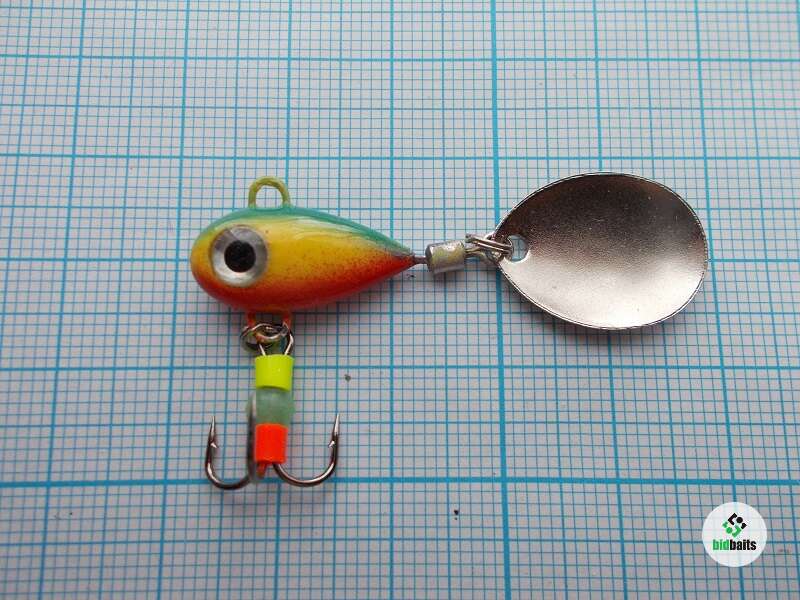 Вес 7 гр. Глаза вклеены в глазные ниши, это затрудняет хищнику повредить их и они будут долго оставаться привлекательной точкой для атаки. Тройник украшен яркими элементами и светонакопительной бусиной. Лепесток вращается ВСЕГДА, даже на падении.
