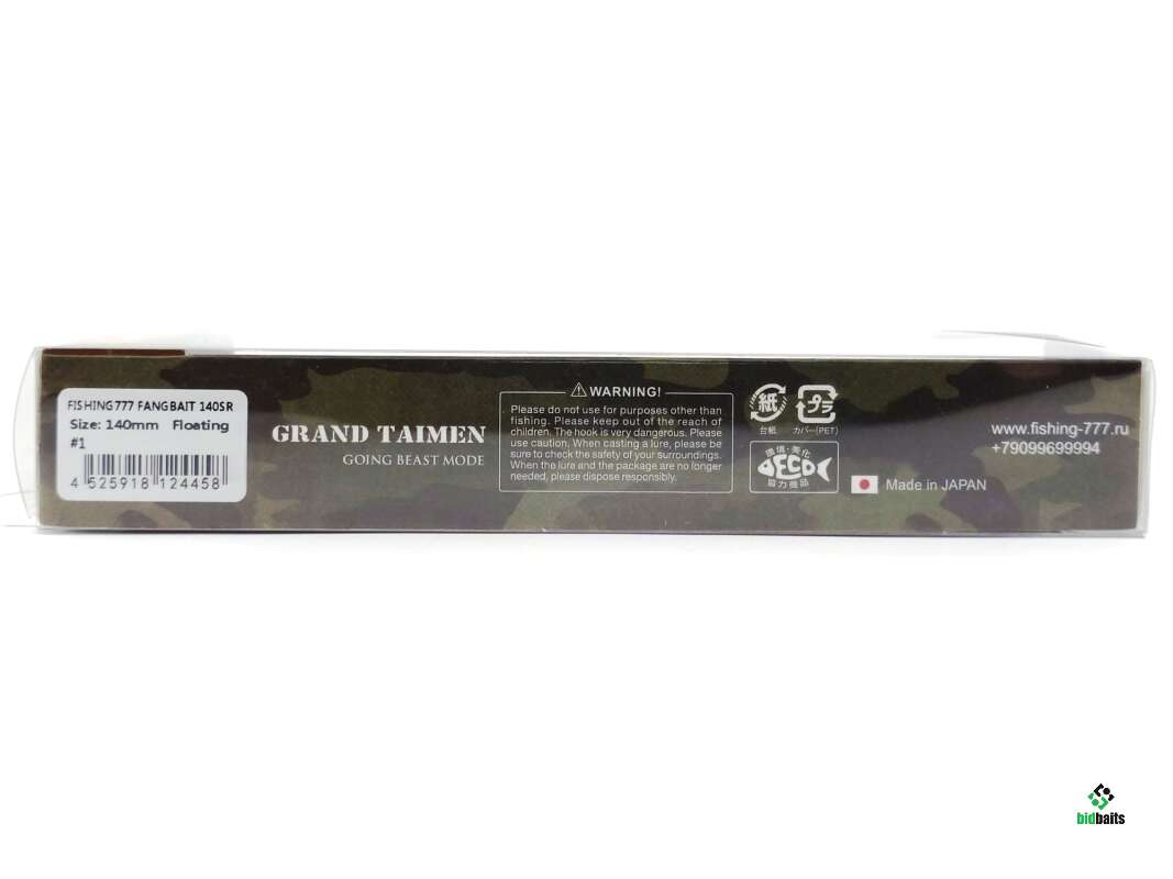 Воблер Fangbait & Fishing-777 - настоящая легенда для ловли крупной щуки и тайменя. Он оснащен сквозным каркасом из проволоки диаметром 1.5 мм и штырями-фиксаторами из нержавеющей стали, что не допускает потери целостность при работе с тяжелой добычей, например тайменем. Корпус изготовлен из прочного пластика с увеличенной толщиной стенок, поэтому он способен выдержать поимку любой рыбы трофейных размеров. Специально по заказу компании Рыбалка-777 воблер был оснащен шумовой капсулой и изменена система балансировки для более выразительного роллинга. Благодаря этим доработкам, воблер стал более уловистым и привлекательным для рыбы даже на равномерной проводке. Воблер отлично работает в различные условия ловли как в спокойной воде, так и на течение.