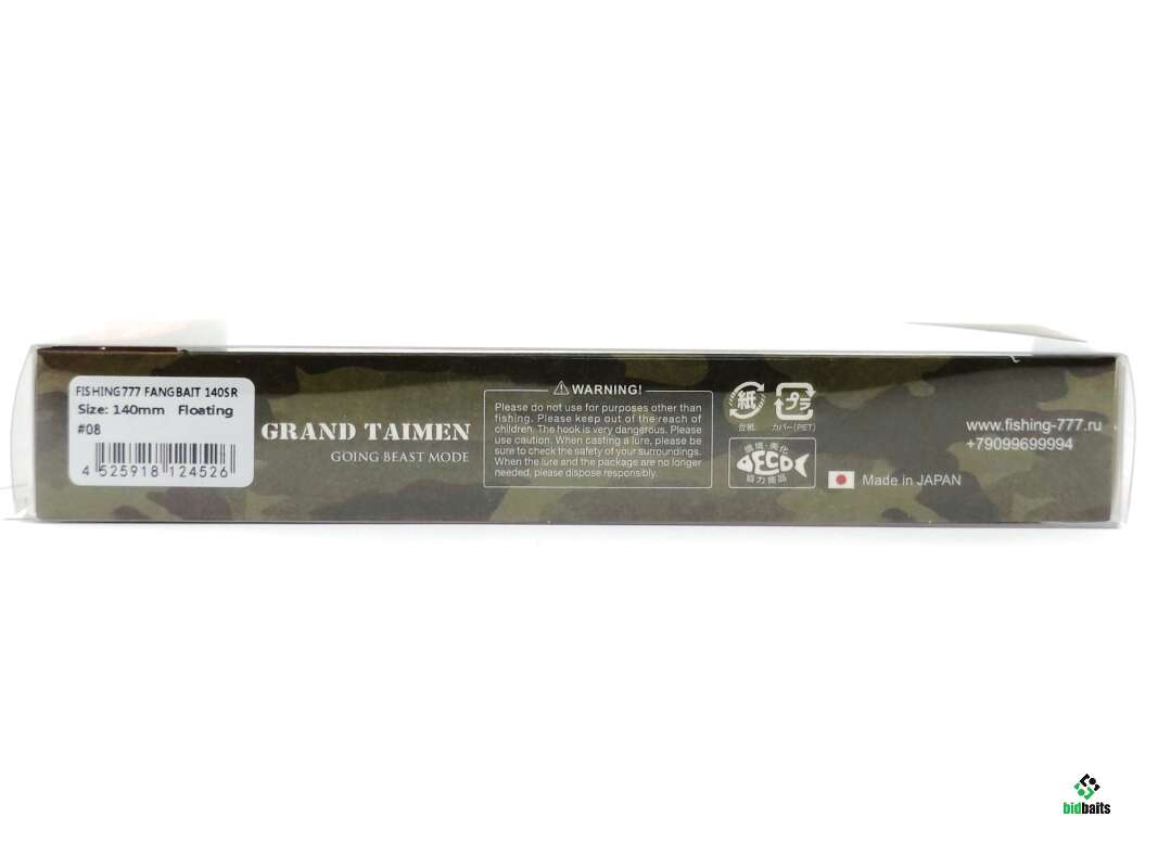 Воблер Fangbait & Fishing-777 - настоящая легенда для ловли крупной щуки и тайменя. Он оснащен сквозным каркасом из проволоки диаметром 1.5 мм и штырями-фиксаторами из нержавеющей стали, что не допускает потери целостность при работе с тяжелой добычей, например тайменем. Корпус изготовлен из прочного пластика с увеличенной толщиной стенок, поэтому он способен выдержать поимку любой рыбы трофейных размеров. Специально по заказу компании Рыбалка-777 воблер был оснащен шумовой капсулой и изменена система балансировки для более выразительного роллинга. Благодаря этим доработкам, воблер стал более уловистым и привлекательным для рыбы даже на равномерной проводке. Воблер отлично работает в различные условия ловли как в спокойной воде, так и на течение.