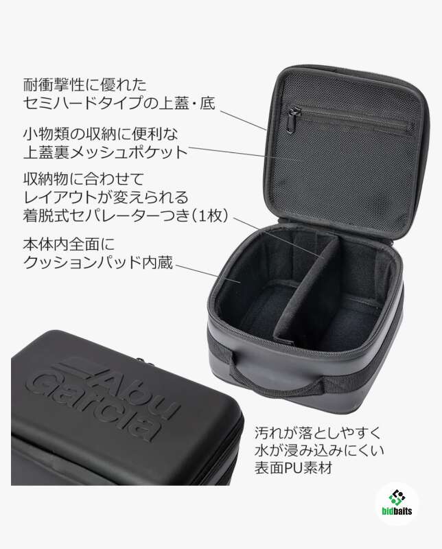 Имеет съемную перегородку посередине. Под крышкой предусмотрен сетчатый карман на молнии, для хранения ручки от катушки или других запчастей или аксессуаров.