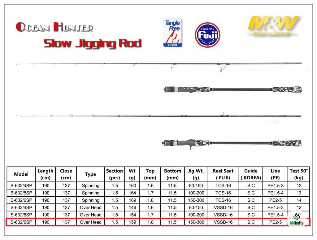 Удилище для слоуджиггинга M&W Ocean Hunter B-632-6SP 190см; 150-300г; PE #2-5; 50° 14кг