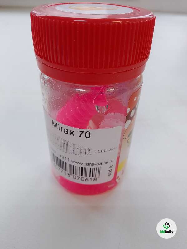Jara Baits Mirax — это силиконовая приманка, имитирующая личинку мухи пчеловидки или мухи журчалки. Она состоит из стержня с дискообразными сегментами и длинного тонкого хвоста. Благодаря своей подвижности и положительной плавучести, Mirax привлекает прудовую форель.
