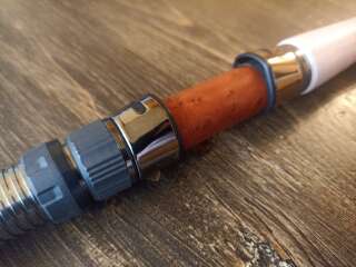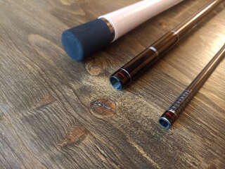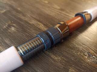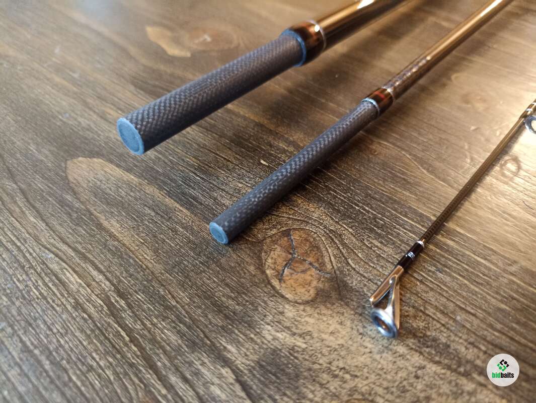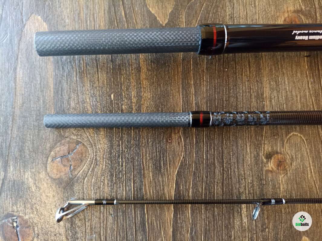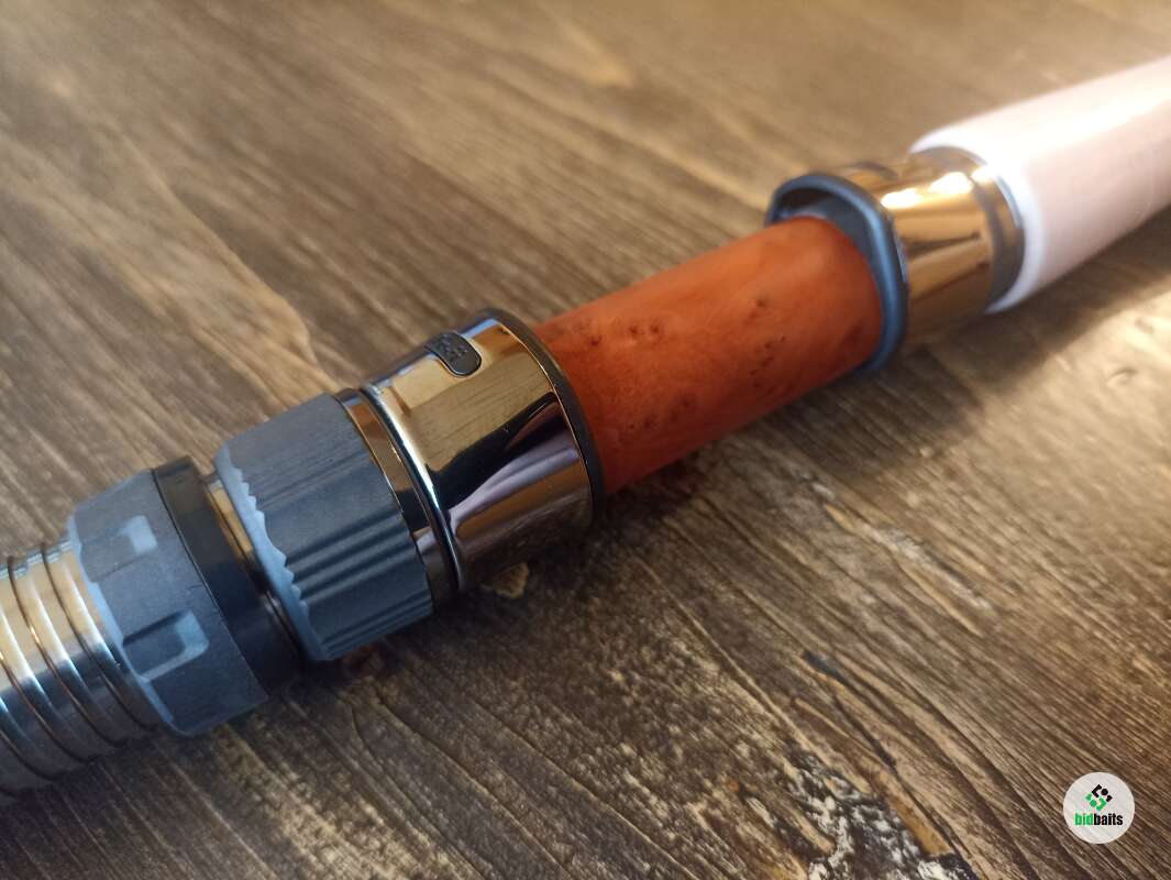 Бланк выполнен из сочетания карбона различной плотности, 24t + 30t + 40t. Вершинка и вторая секция оснащены кольцами Fuji SiC в титановых рамках, комлевая сеция кольцами SiC в рамках из нержавейки. Большие пропускные кольца позволяют работать спиннингом даже в условиях поздней осени, при обледенении лески или шнура. Строй спиннинга облегчает подачу в условиях встречного или бокового ветра. Вставка катушкодержателя из натурального стабилизированного дерева. Нижнее расположение гайки катушкодержателя (гайка + контргайка).