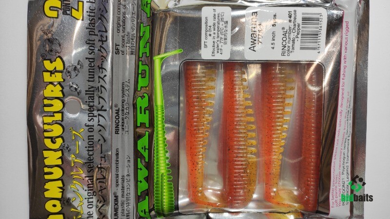 Виброхвосты Awaruna изготовлены из мягкого износоустойчивого пластика Gumexim с добавлением фирменного аттрактанта Homunculures-SFT. Приманка имеет очень интересную конструктивную особенность: в теле приманки, строго по центру, расположено отверстие, позволяющее идеально ровно насаживать ее на джиг-головку или двойник. Небольшой паз на спине позволяет прятать в него жало офсетного крючка, тем самым превращая приманку практически в "незацепляйку".