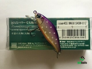 Ima Issen 45S Max,относится к ультралайтовому классу снастей. Обновленный Ima Issen 45S Max благодаря увеличению веса по отношению к базовой модели стал чуть дальше улетать и глубже заныривать. Данный воблер предназначается для ловли различных лососевых рыб в условиях быстрого речного течения. С учетом тонущего исполнения, масса приманки весьма небольшая. Благодаря этому, отзывчивость Issen 45S Max на всевозможные манипуляции удилищем крайне высокая. Воблер чутко реагирует на любые замедления анимации, легкие рывки и потяжки спиннингом. Основная специфика – ловля кросс апстримом, то есть заброс по диагонали вверх по течению, когда поток воды в большей мере взаимодействует с боком приманки, вкупе с различными рывковыми анимациями удается добиться неповторимой игры, достигаемой как за счет особенностей формы, так и благодаря особым настройкам лопатки. ISSEN 45S Max удерживает любую струю при проводке против течения и всегда выглядит привлекательным для рыбы, проходя границы струй и водоворотов. Поэтому, оставаясь на одном и том же месте, вы можете охватывать максимально большое пространство, экономя тем самым время на перемещениях. Данный воблер отлично зарекомендовал себя и при ловле прудовой форели. Окраски IMA Issen 45S Max хоть и относятся к форелевому типажу, но выдержаны в нейтральной концепции, актуальной и в обычных условиях, например, охоте на голавля.