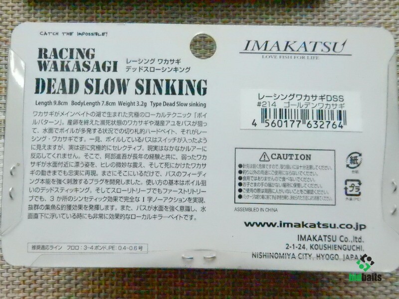 Этот воблер можно отнести к разряду уокеров, превосходная поверхностная приманка. Imakatsu RACING WAKASAGI - 100% ная имитация раненого малька, который, как известно, является лучшим провокатором для хищной рыбы. Рекомендуется рывковая техника и с длительными паузами, при рывках, воблер производит рыскающие в разные стороны движения, а на паузе - располагается на боку на поверхности воды, реалистично изображая умирающую жертву, именно в этот момент у хищника сдают нервы и в этот момент происходит мощная и активная поклевка. Очень эффективная приманка для ловли жереха. Не проплывет мимо окунь и щука.