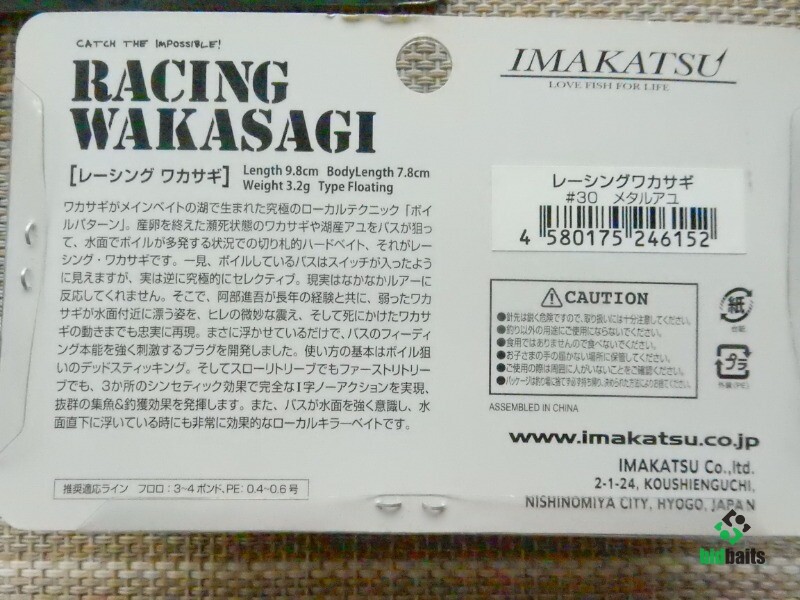 Этот воблер можно отнести к разряду уокеров, превосходная поверхностная приманка. Imakatsu RACING WAKASAGI - 100% ная имитация раненого малька, который, как известно, является лучшим провокатором для хищной рыбы. Рекомендуется рывковая техника и с длительными паузами, при рывках, воблер производит рыскающие в разные стороны движения, а на паузе - располагается на боку на поверхности воды, реалистично изображая умирающую жертву, именно в этот момент у хищника сдают нервы и в этот момент происходит мощная и активная поклевка. Очень эффективная приманка для ловли жереха. Не проплывет мимо окунь и щука.