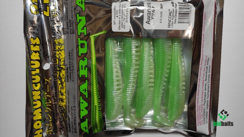 Виброхвосты Awaruna изготовлены из мягкого износоустойчивого пластика Gumexim с добавлением фирменного аттрактанта Homunculures-SFT. Приманка имеет очень интересную конструктивную особенность: в теле приманки, строго по центру, расположено отверстие, позволяющее идеально ровно насаживать ее на джиг-головку или двойник. Небольшой паз на спине позволяет прятать в него жало офсетного крючка, тем самым превращая приманку практически в "незацепляйку".